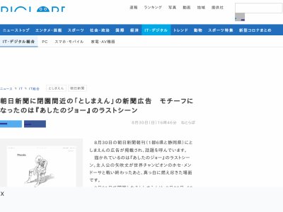 朝日新聞に閉園間近の「としまえん」の新聞広告 モチーフになったのは『あしたのジョー』のラストシーン (1/2)