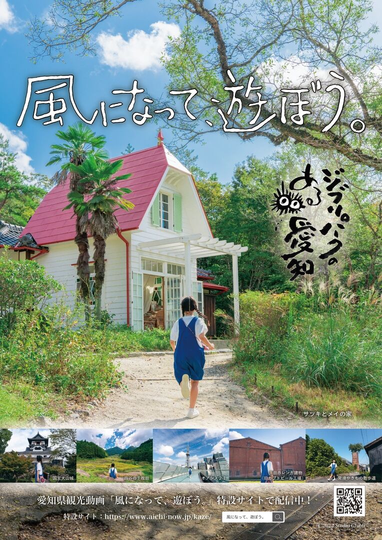 さらに、「ジブリパークのある愛知」の魅力を、スタジオジブリが観光動画として制作した「風になって、遊ぼう。~ジブリパークのある愛知~」もYouTubeで公開。ドローンによる空撮を中心とした映像で、映画監督の中川龍太郎、映像ディレクターのUssiy、音楽の岩崎太整が、愛知県を舞台に描き出している。題字は鈴木敏夫プロデューサーで、作中に登場する版画は、版画家・宮崎敬介氏の作品。