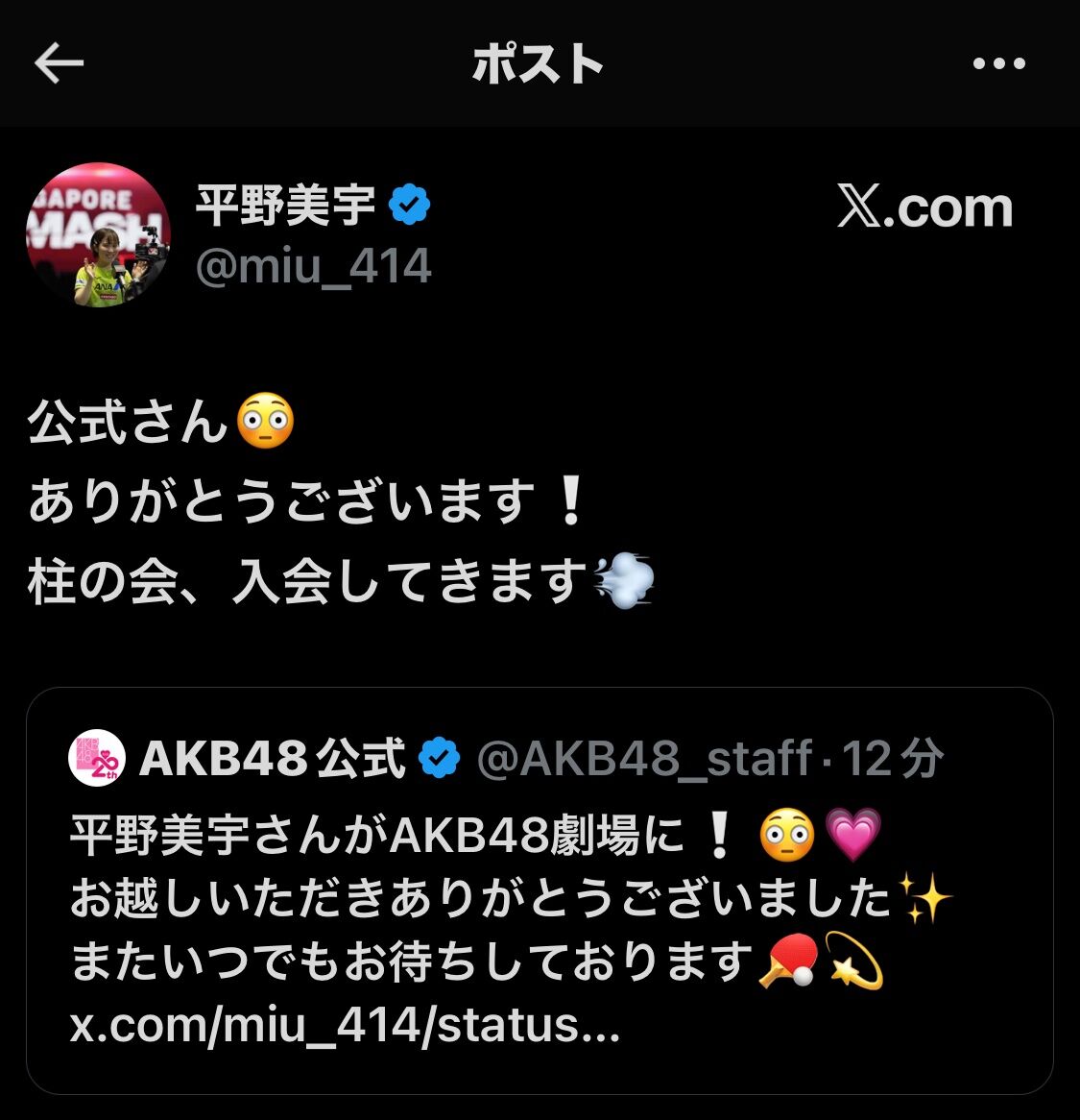 平野美宇選手のAKB48劇場初観覧、素晴らしいニュースです。彼女のような優れたアスリートが、エンターテイメントとどう関わっていくのか大変楽しみです。今後、平野選手がどのようにこの経験が彼女の競技に影響を与えるのか、注目していきたいと思います。