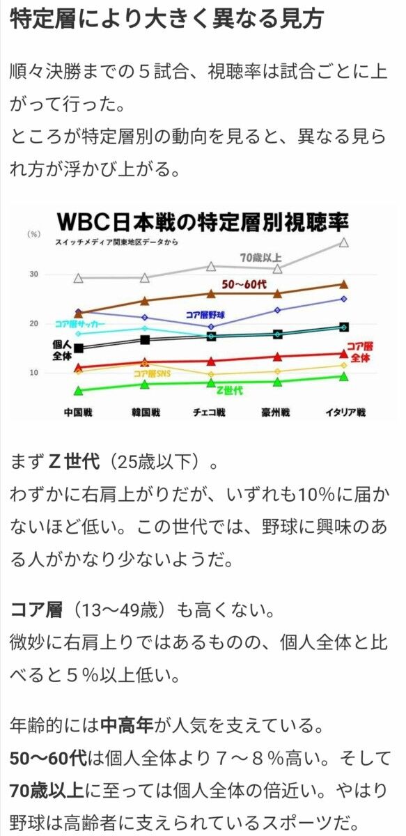 年齢的には中高年が人気を支えている。50~60代は個人全体より7~8%高い。そして70歳以上に至っては個人全体の倍近い。やはり野球は高齢者に支えられているスポーツだ。